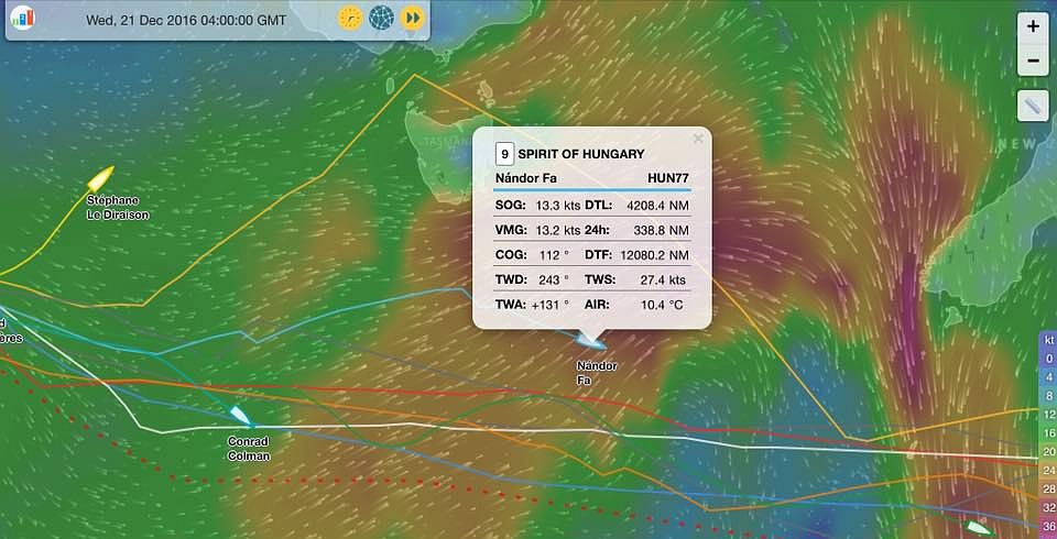 A versenyen december 19-én ketten is hajójukra végzetes balesetet szenvedtek. A Spirit of Hungary közvetlen vetélytársa Stéphane Le Diraison elvesztette az árbócát. A legfrissebb hírek szerint egy a beksztéget tartó verete tört el és ez okozta a bajt. A francia versenyző egy 7 méteres segédrudazatot eszkábált és azzal vitorlázik Melbourne felé. Várhatóan bő egy hét alatt érhet oda. (Az eredménylistán még szerepel, de természetesen kiállt a versenyből.)