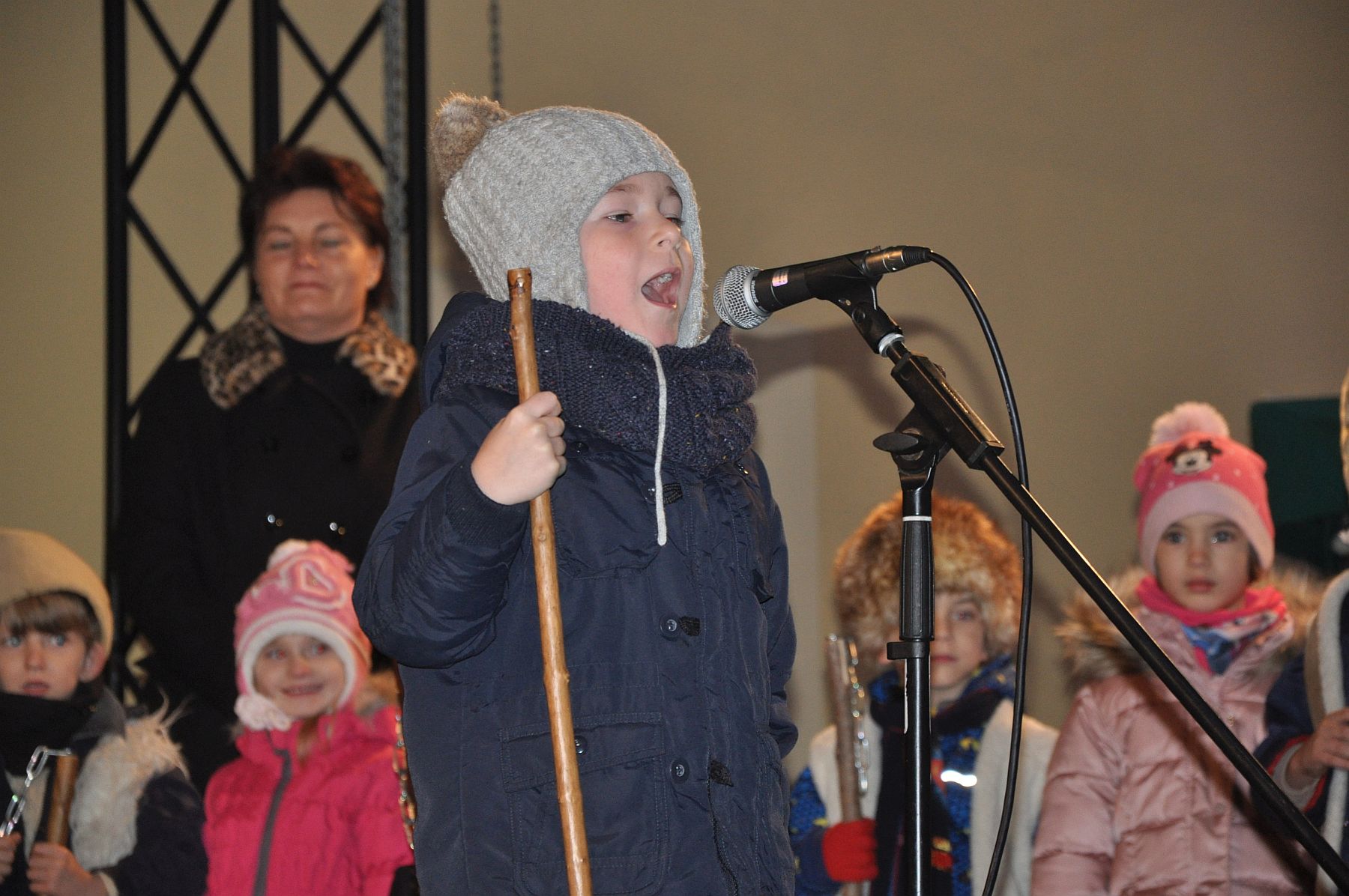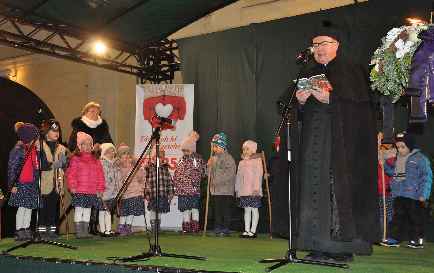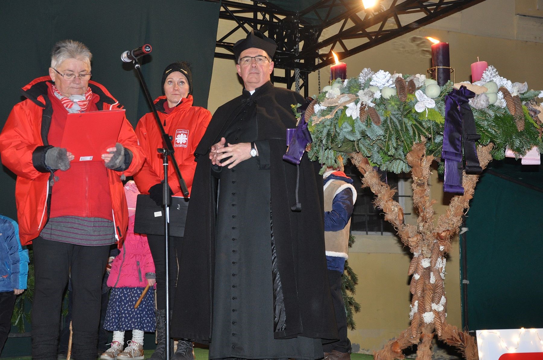 A Püspökség udvarán felállított színpadon Ugrits Tamás, irodaigazgató, pasztorális püspöki helynök köszöntötte a második gyertyagyújtására érkezőket, majd a vasárnapi evangéliumot és adventi gondolatait adta útravalóul.
