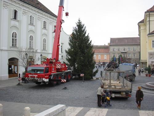 Pénteken állították fel Székesfehérvár karácsonyfáját a Városház téren. A több mint 14 méteres fenyőfát a tűzoltóság 80 tonnás darujának a segítségével percek alatt a helyére tudták állítani a Székesfehérvári Tűzoltóság szakemberei. A díszítést azonban - több okból is kifolyólag - még nem tudják elkezdeni. (képgaléria arról, hogyan állította fel a fenyőfát a 80 tonnás tűzoltósági daru)