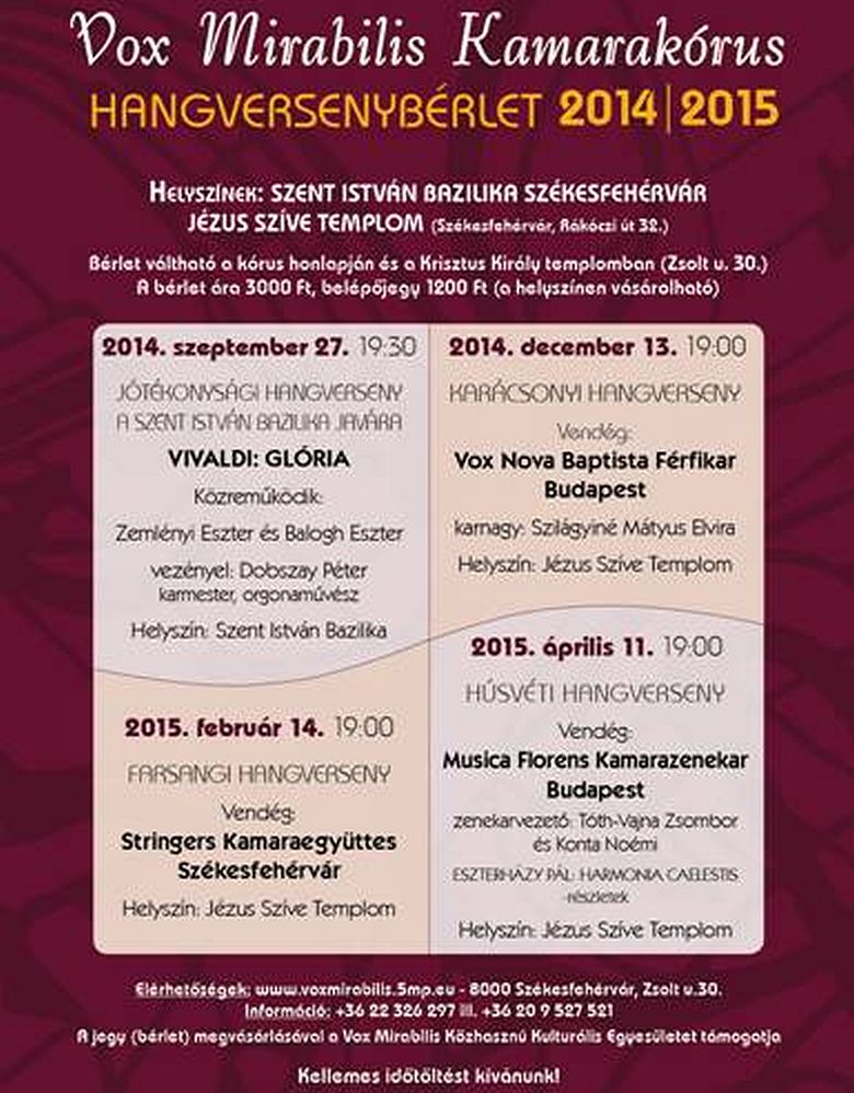 Már kapható a Vox Mirabilis Kamarakórus hangversenybérlete a 2014/15-ös évadra. A bérlet megvásárolható a kórus honlapján és a Krisztus Király Templomban (Zsolt u. 30.). A bérlet ára 3000 Forint, míg a belépőjegyért 1200 Forintot kell fizetni, amely a helyszínen vásárolható meg. A bérlet ára négy előadást tartalmaz, melyből az elsőt, Vivaldi: Glóriáját 2014. szeptember 27-én, este 19.30-kor rendezik meg a Szent István Bazilikában.