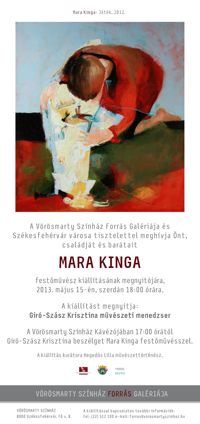 Május 15-én szerdán 18 órakor nyílik meg Mara Kinga festőművész kiállítása a Vörösmarty Színház Forrás Galériájában. A kiállítás előtt, 17 órától a Vörösmarty Színház kávézójában Giró-Szász Krisztina művészeti menedzser beszélget az alkotóval. A fiatal festőművésznő egyéni, erőteljes faktúrájú festményekkel mutatkozik be Fehérváron.