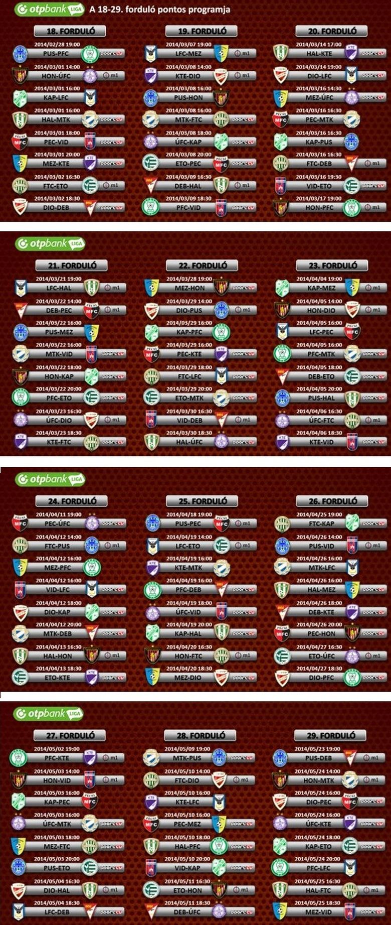 Az MLSZ-ben elkészítették az OTP Bank Liga csaknem teljes tavaszi időbeosztását. Az utolsó forduló pontos menetrendjét később határozzák meg, de addig már minden fordulóban kijelölték az időpontokat és a televíziós közvettések beosztása is elkészült. Nem meglepő módon a Videoton minden bajnokija képernyőre kerül, a második helyen álló fehérváriak a tulajdonos távozása miatt nehéz helyzetbe kerülő Pécs otthonában kezdenek március első napján.