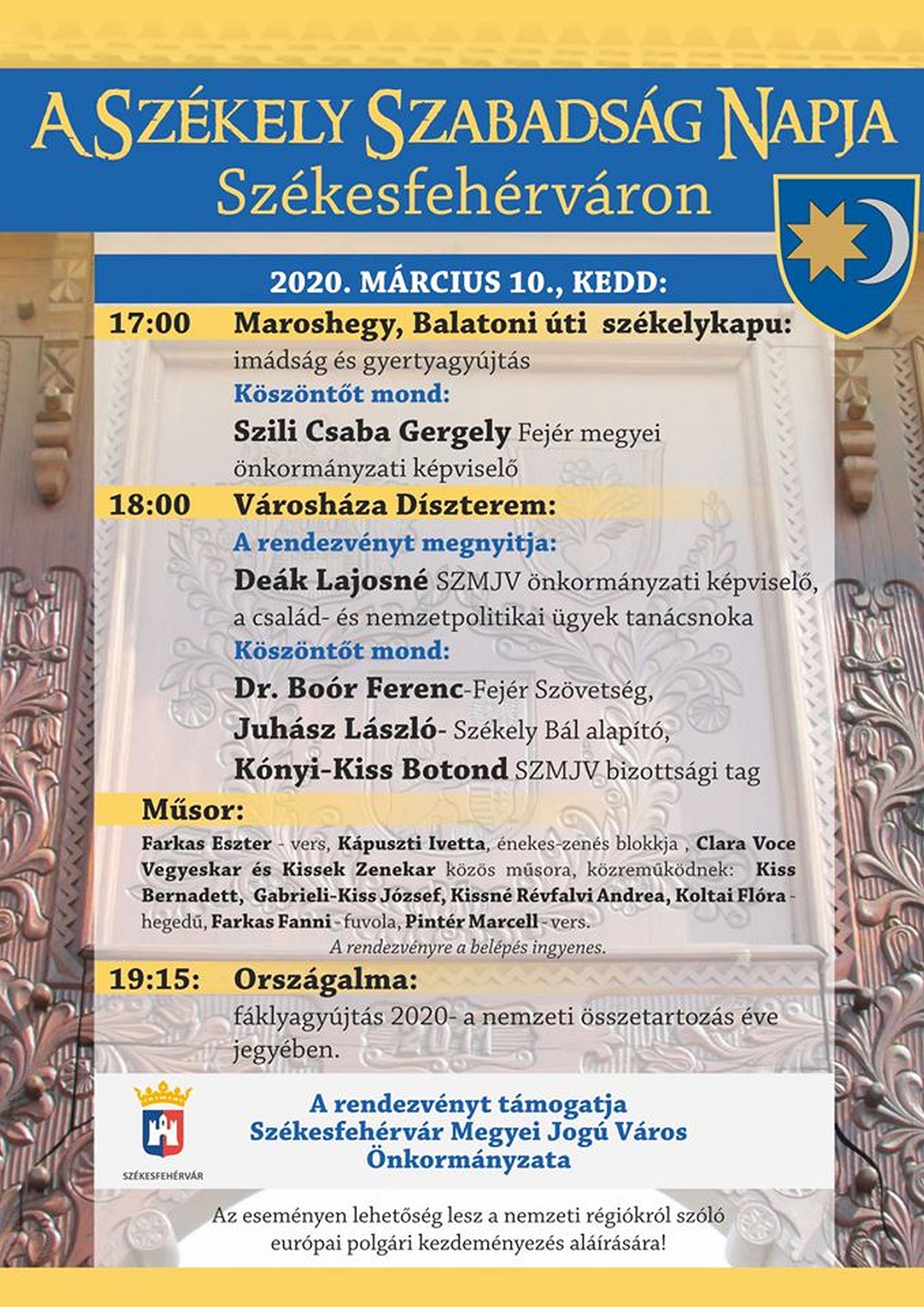 A fehérvári megemlékezés programjait Juhász László, önkormányzati képviselő, a Székesfehérvári Székely Bál alapítója ismertette, aki köszönetet mondott Székesfehérvár Önkormányzatának, amiért már negyedik éve a civil kezdeményezés mögé állt: „Március 10-én, kedden 17 órára várjuk a megemlékezőket a Maroshegyre, a Balatoni úti székelykapuhoz, ahol Szili Csaba Gergely és Dr. Boór Ferenc köszöntője után közös imádságos gyertyagyújtás lesz.”