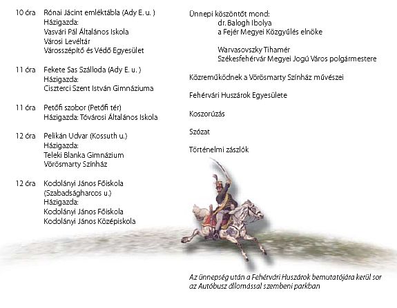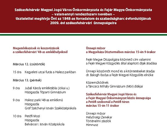 Pénteken a Petőfi Mozinál, a Fekete Sas Szállónál, a Halesz Parki '48-as emlékműnél és a Pelikán Udvarban is középiskolások elevenítették fel Március 15. eseményeit. A vasárnapra eső Nemzeti Ünnepen pedig a Megyeháza Dísztermében kitüntető címek átadásával kezdődik a megye és a város közös ünnepsége, majd a Petőfi szobornál a Petőfi téren 11 órakor lesz ünnepi műsor. Az ünnepség után a parkban a Fehérvári Huszárok tartanak bemutatót.