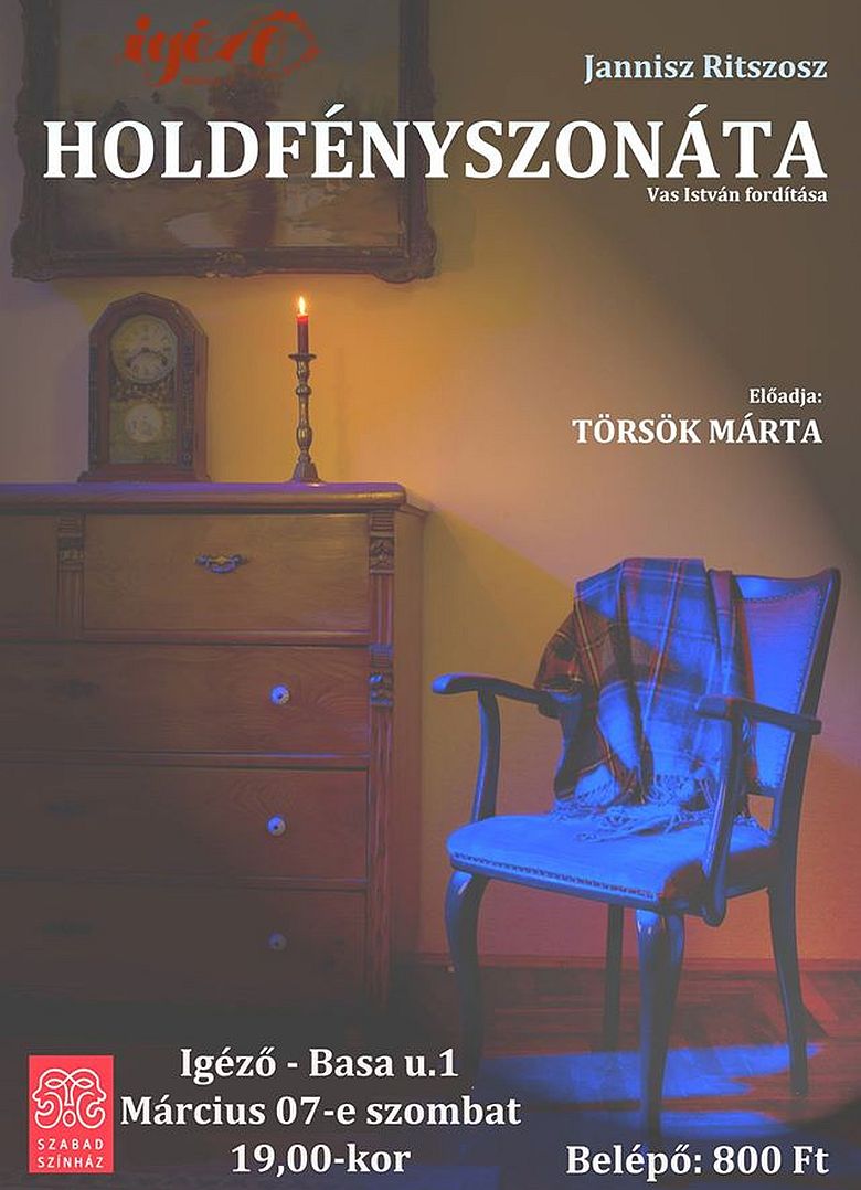 A közismert görög író-költő, Jannisz Ritszosz: Holdfény- szonáta című művét Törsök Márta előadásában március 7-én, szombaton 19 órától láthatja a közönség az Igézőben (Basa utca 1.). A színésznő több évtizede talált rá a műre, ám igazán csak idén nyáron érett meg benne az elhatározás arra, hogy közönség előtt is bemutassa.