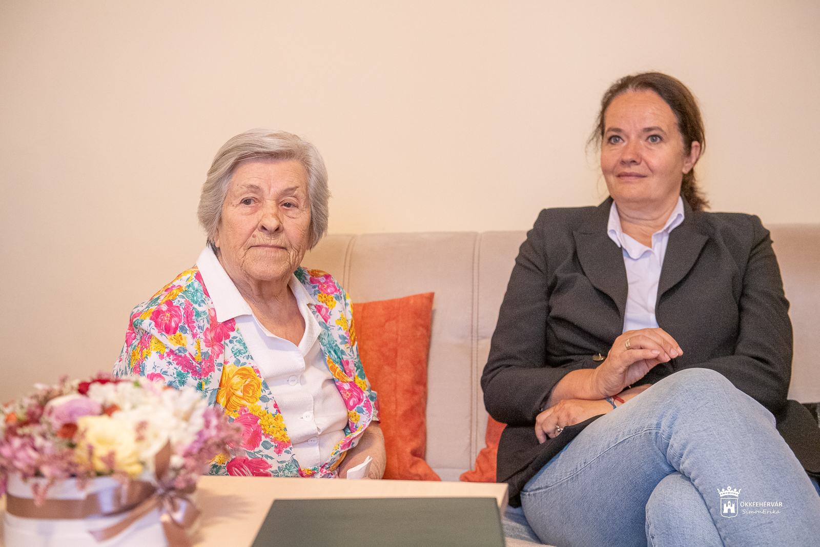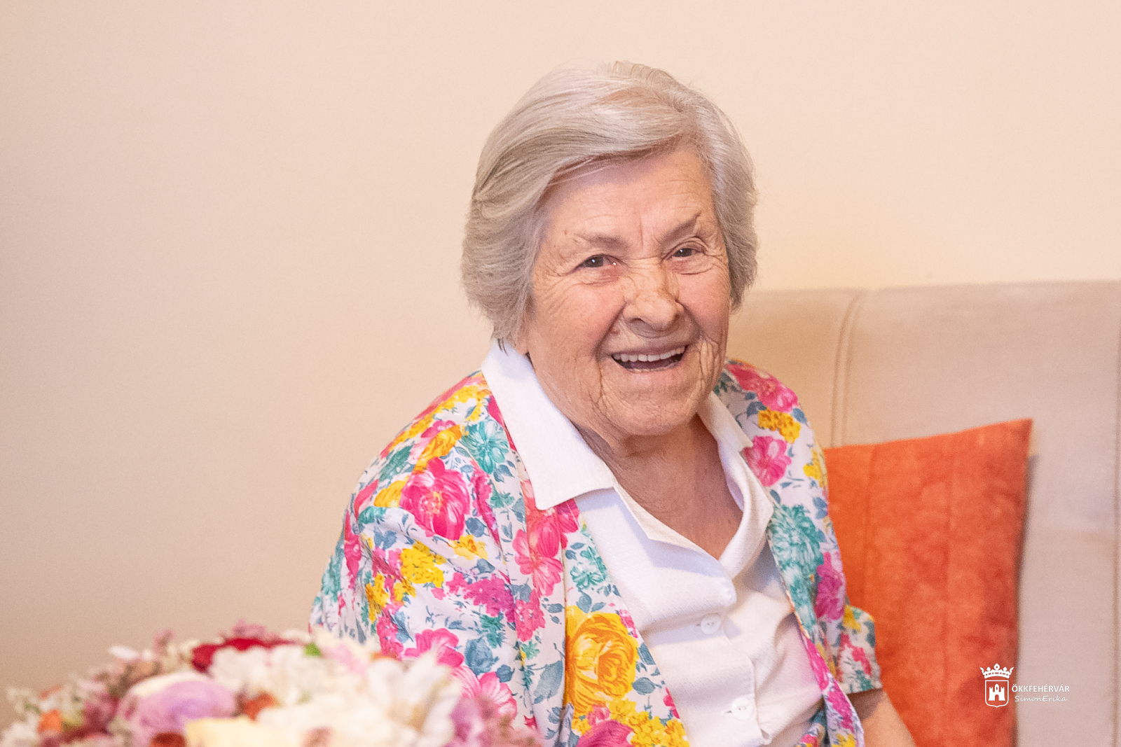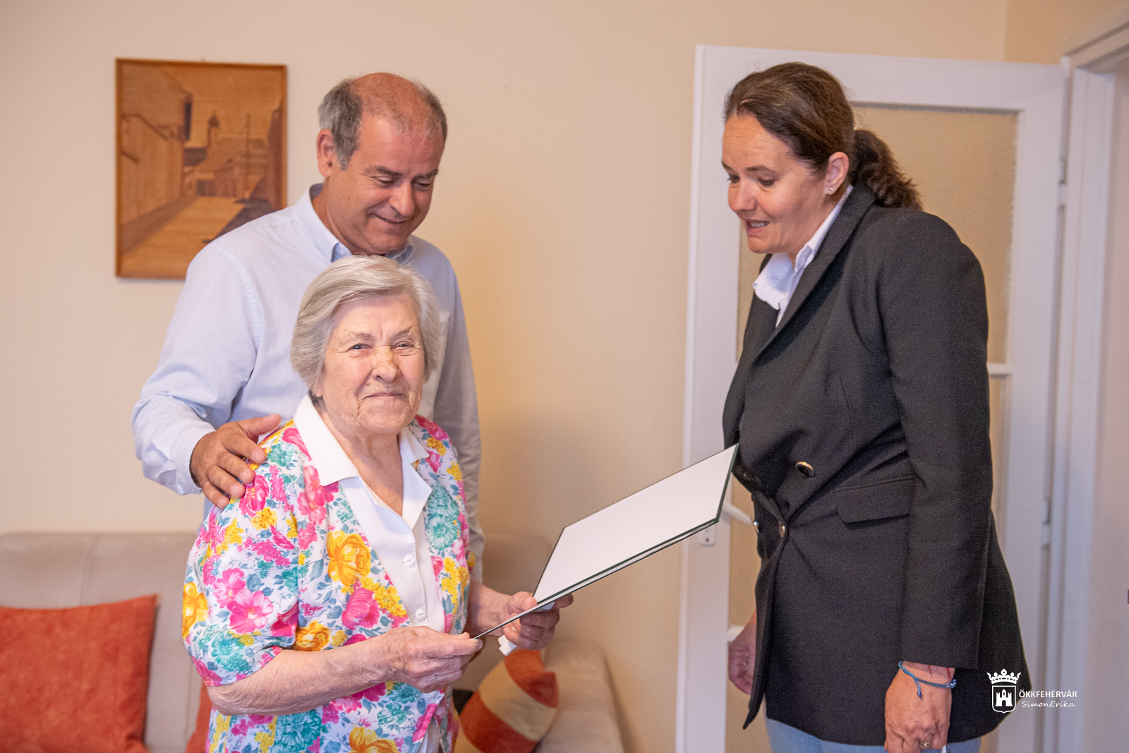 90. születésnapja alkalmából dr. Kovács Zsoltné önkormányzati képviselő köszöntötte fel, átadva Marika néninek a város ajándékát és a miniszterelnöki, gratuláló emléklapot.