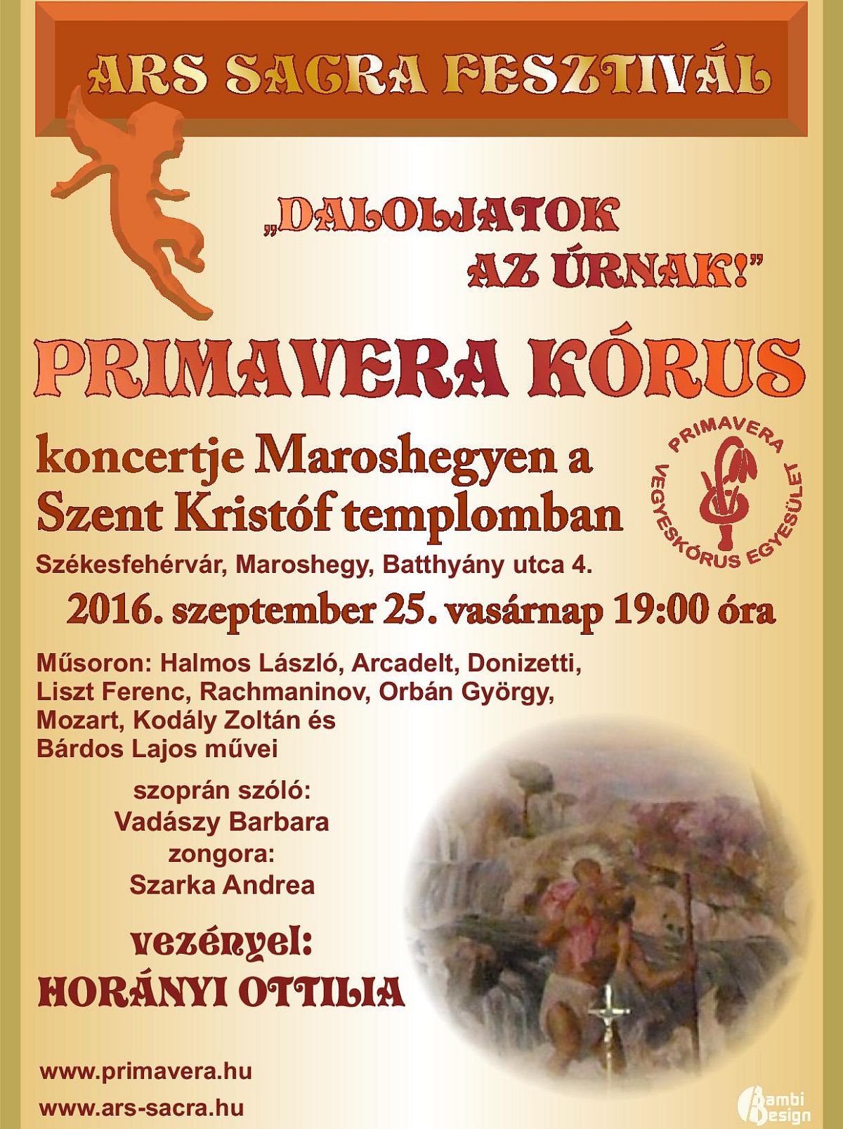 A nemzetközi Városmissziós rendezvény- sorozat gyümölcseként számon tartott Ars Sacra Fesztivál 2007-ben indult, s azóta is minden évben megrendezik. Az idei programba a Primavera Kórus is bekapcsolódott. „Daloljatok az Úrnak!” címmel adnak koncertet a maroshegyi Szent Kristóf templomban vasárnap 19 órakor.