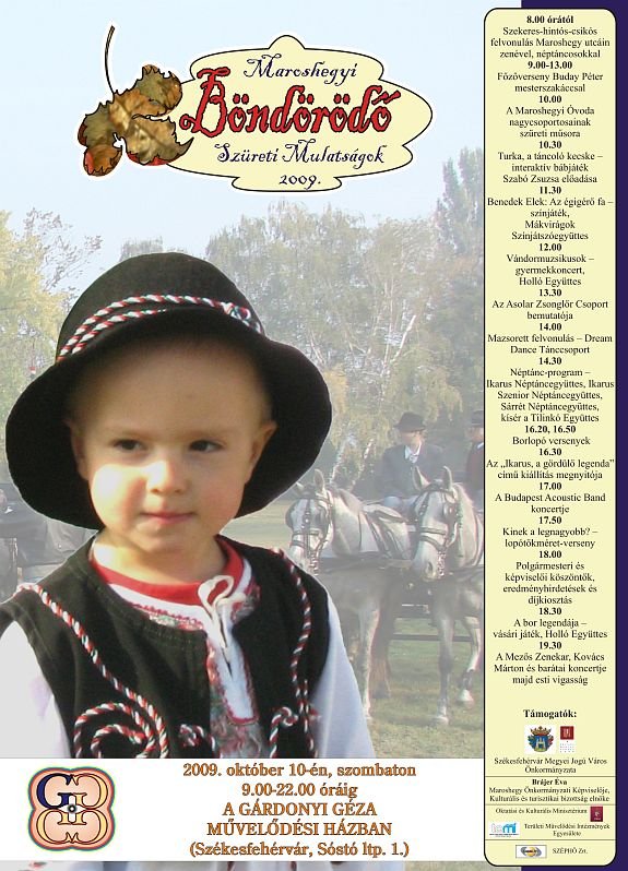 Brájer Éva a Maroshegy önkormányzati képviselője szeretettel invitálta a fehérváriakat, hogy „böndörödjenek együtt” szombaton. Mint mondta tavaly hosszú szünet után, mint régi hagyományos rendezvényként akarták visszahozni. Adorján Viktor a programokat szervező művelődési ház igazgatója arról beszélt, hogy kevesebb már ugyan a szőlő a Maroshegyen,de van még elég ahhoz, hogy szüreti mulatságokat rendezzenek. A szüreti hangulatot a rendkívül színes programok mellett egy szőlőprés is segíti megteremteni, ahol egész nap friss mustot ihatnak a családok. A programok mindegyike ingyenes.