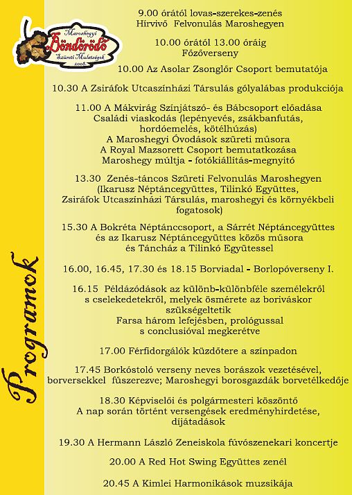 Adorján Viktor a Gárdonyi Géza Művelődési Ház igazgatója a szüreti felvonulás és a színpadi programok mellett a főzőversenyre, a családi viaskodásra, a madárijesztő kiállításra és a férfidorgálók kűzdőterére hívta fel a figyelmet. A főzéshez alapanyagot, bográcsot, állványt és fát is biztosítanak a szervezők.