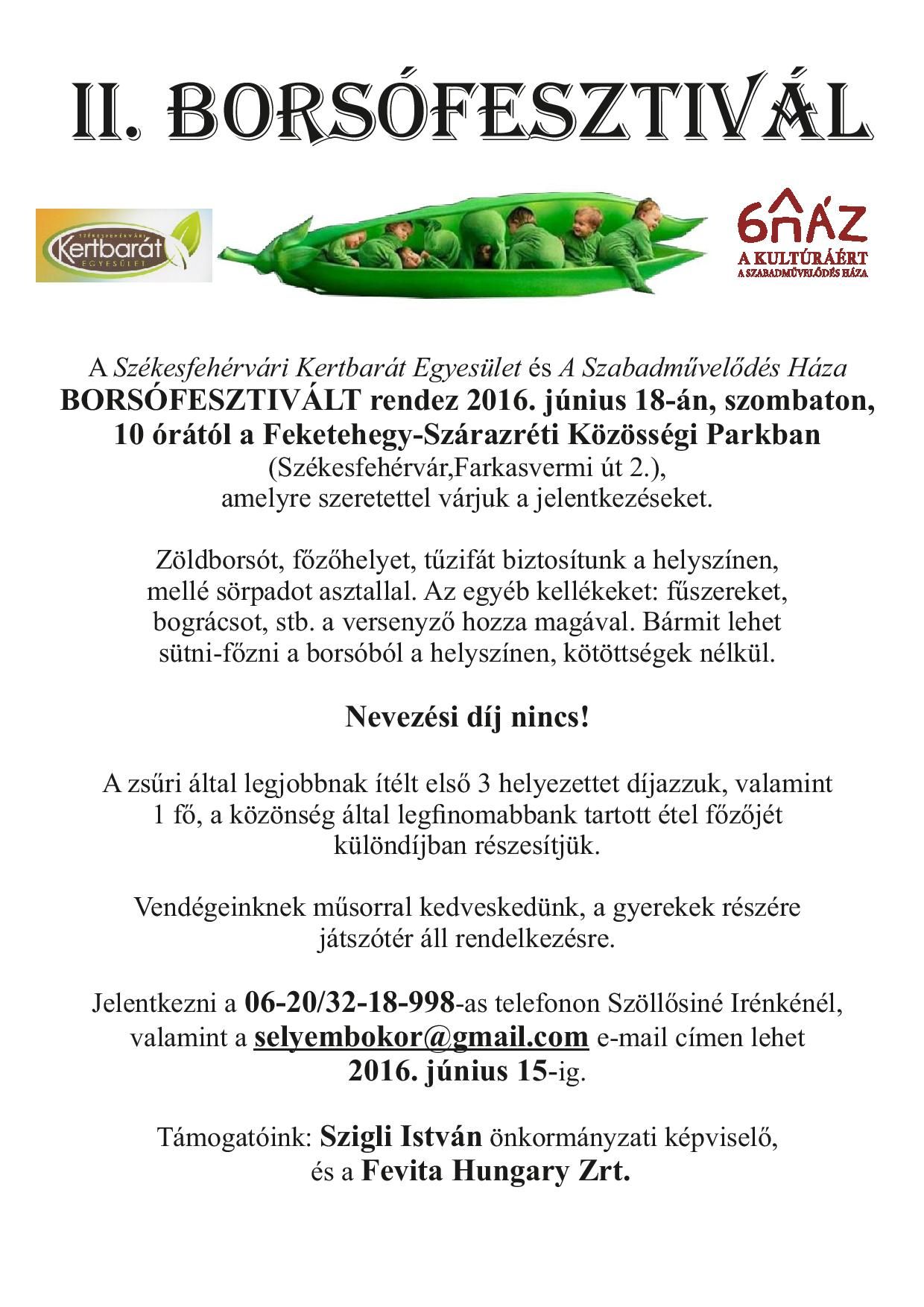 Június 18-án szombaton 10 órától második alkalommal rendezik meg a Borsófesztivált a Feketehegy-Szárazréti Közösségi Parkban. A nevezéseket június 15-ig várják a 06-20/3218988-as telefonszámon vagy a selyembokor@gmail.com e-mail címen. Zöldborsót, főzőhelyet, tűzifát a helyszínen biztosítanak, bográcsot, fűszereket és egyéb kellékeket a versenyzők hoznak magukkal.