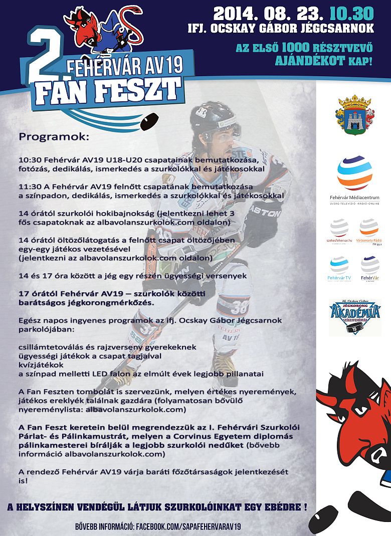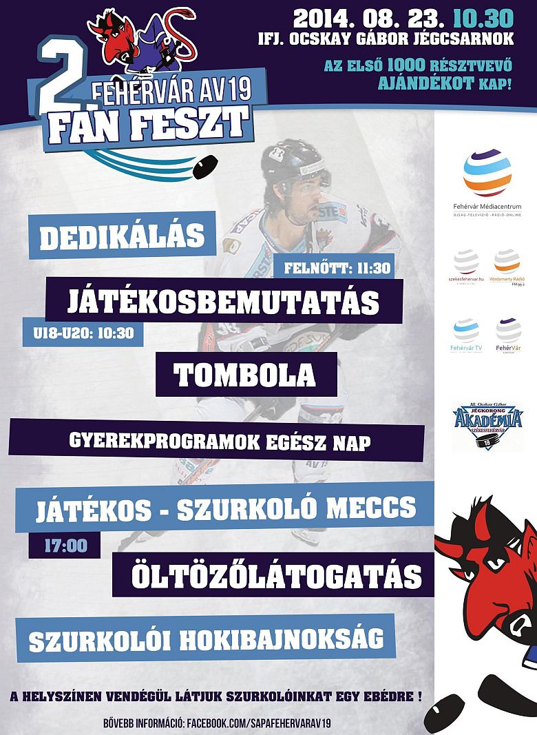 Augusztus 23-án, szombaton immár második alkalommal kerül megrendezésre a tavaly is nagy sikert aratott Fan Feszt. A program keretében idén még több és még színesebb programokkal várják a szervezők a Fehérvár AV19 szurkolóit. Az esemény szombaton délelőtt 10.30-kor kezdődik az ifj. Ocskay Gábor Jégcsarnoknál. A tavalyi programhoz hasonlóan az első 1000 érkező most is ajándékot kap.