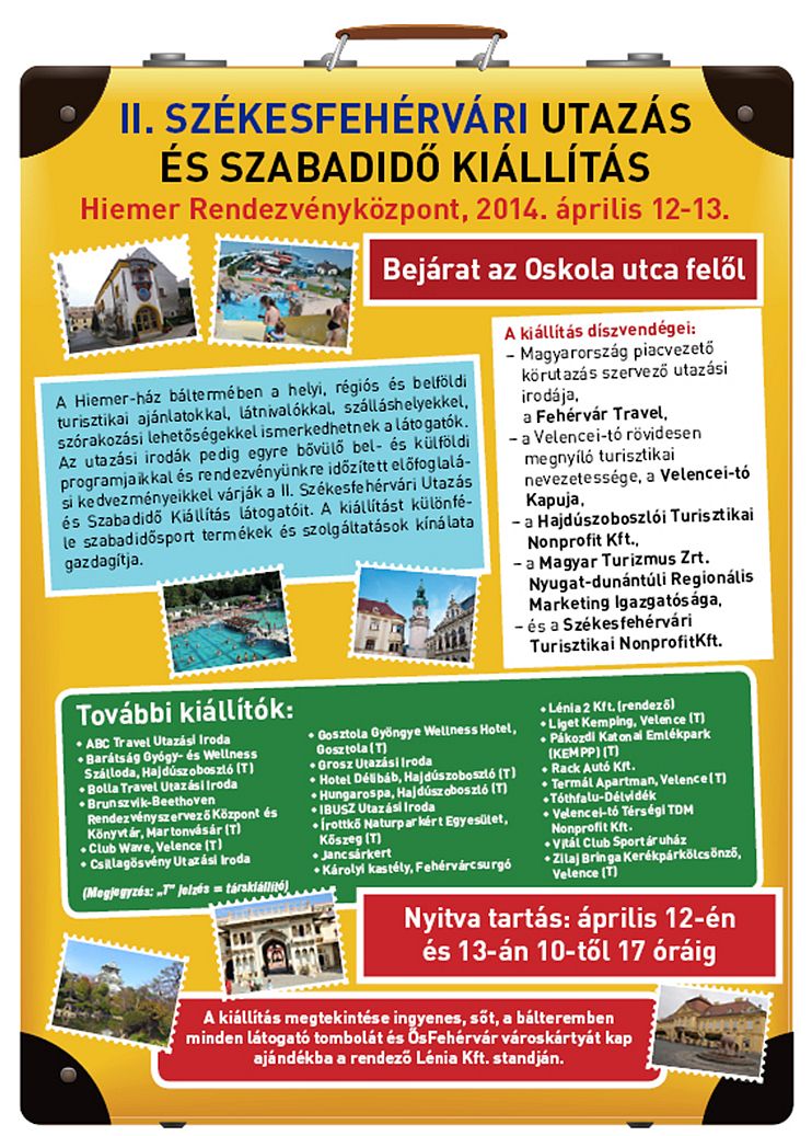 A Hiemer-ház báltermében bel- és külföldi turisztikai ajánlatokkal, régiós és országos látnivalókkal, szálláshelyekkel, szórakozási lehetőségekkel ismerkedhetnek az érdeklődők április 12-én és április 13-án 10 és 17 óra között. Az utazási irodák pedig egyre bővülő hazai és belföldi programjaikkal és a rendezvényre időzített előfoglalási kedvezményeikkel várják a kiállítás látogatóit. "Ez a rendezvény megvetette a lábát Székesfehérváron. A siker legbiztosabb fokmérője, hogy a tavalyi kiállítók szinte mindegyike eljön. 2013-ban 17 kiállító hozta el ajánlatait, idén 30 felett lesz a létszám." – hangsúlyozta az ötletgazda és az egyik főszervező Lénia 2 Kft. ügyvezetője. Posch Ede elmondta: a Báltermen kívül igénybe veszik a Boross termet is, ahol több kiállító prezentációval, kisfilmekkel is bemutatkozik. A rendezvény ezúttal is nemzetközi lesz. Tavaly a felvidéki Búcs vett részt a kiállításon, nagy sikert aratva a Viseletes Babák Háza kollekciójával. Posch Ede, a kiállítást szervező Lénia Kft. ügyvezetője elmondta, hogy most a Délvidékről érkező Tóthfalut hívták meg a kiállításra. A Szabadkától mintegy 20 kilométerre délre található, színmagyar lakosságú település a vajdasági falusi turizmus egyik bástyája, a délvidéki túrák fontos bázisa.
