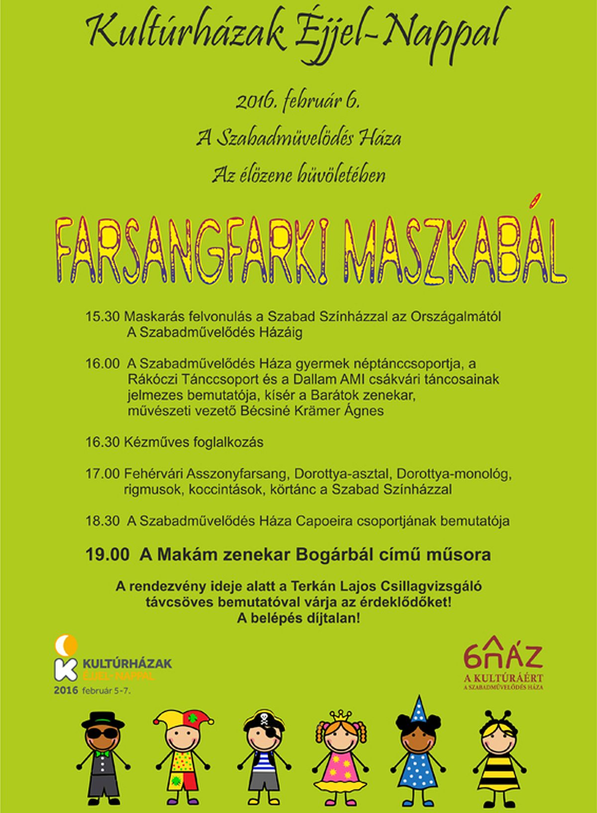 Ezen a napon három másik fehérvári kulturális intézmény is programokkal készül, tekintettel a farsangra, valamint a Kultúrházak éjjel-nappal országos rendezvénysorozatra. 15.30 órától A Szabadművelődés Háza szervezésében Farsangi Maszkabál veszi kezdetét, ami maskarás felvonulással indul az Országalmától, 15 órától a Művészetek Házában DÍ-NOM DÁ-NOM zajlik,
