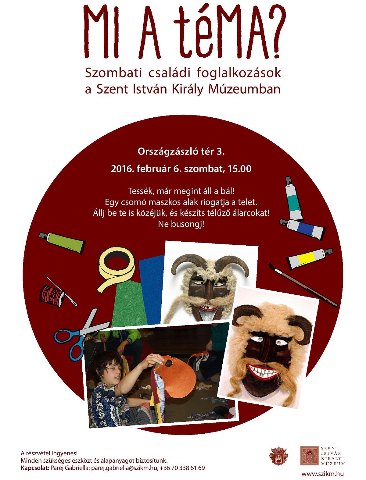 Családoknak kínál hasznos és egyben érdekes programot szombatonként a Szent István Király Múzeum. A most már hagyományosnak mondható Mi a téMA? szombati családi foglalkozások mindig más-más téma köré épülnek. Az idei harmadik alkalom a farsang jegyében fog telni, hiszen áll a bál, s egy csomó maszkos alak riogatja majd a hétvégén a telet. Ebből a múzeum, s az oda látogatók sem maradhatnak ki. Télűző álarcokat készítenek, és még az is ki fog derülni, hogyan is kell tikverőzni!? Se gyerekeknek, se felnőtteknek nem kell búslakodniuk, csak felvenni a maszkokat, s mindjárt űzhető is el a tél! A foglalkozás – ahogy az eddigi szombatokon is – 10 órakor kezdődik a Szent István Király Múzeum Országzászló téri épületében.