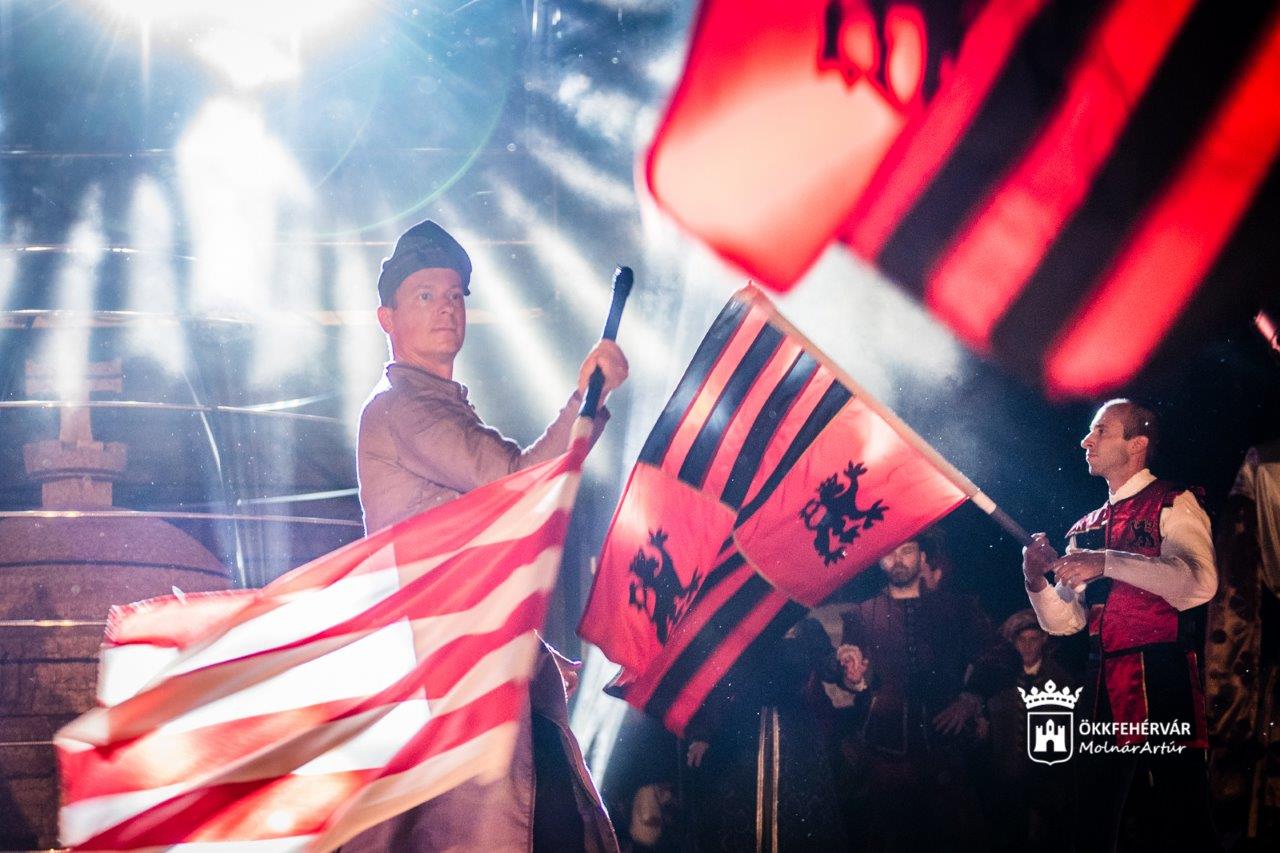 A krónikás, Bonfini szerepében Egyed Attilát, a Vörösmarty Színház színművészét láthattuk. Ezt követően a Vox Mirabilis Kamarakórus, valamint Szirtes Edina Mókus és zenésztársai léptek színpadra, majd a középkori furulyaegyüttes és a Bandiera zászlóforgatók zárták a műsort.