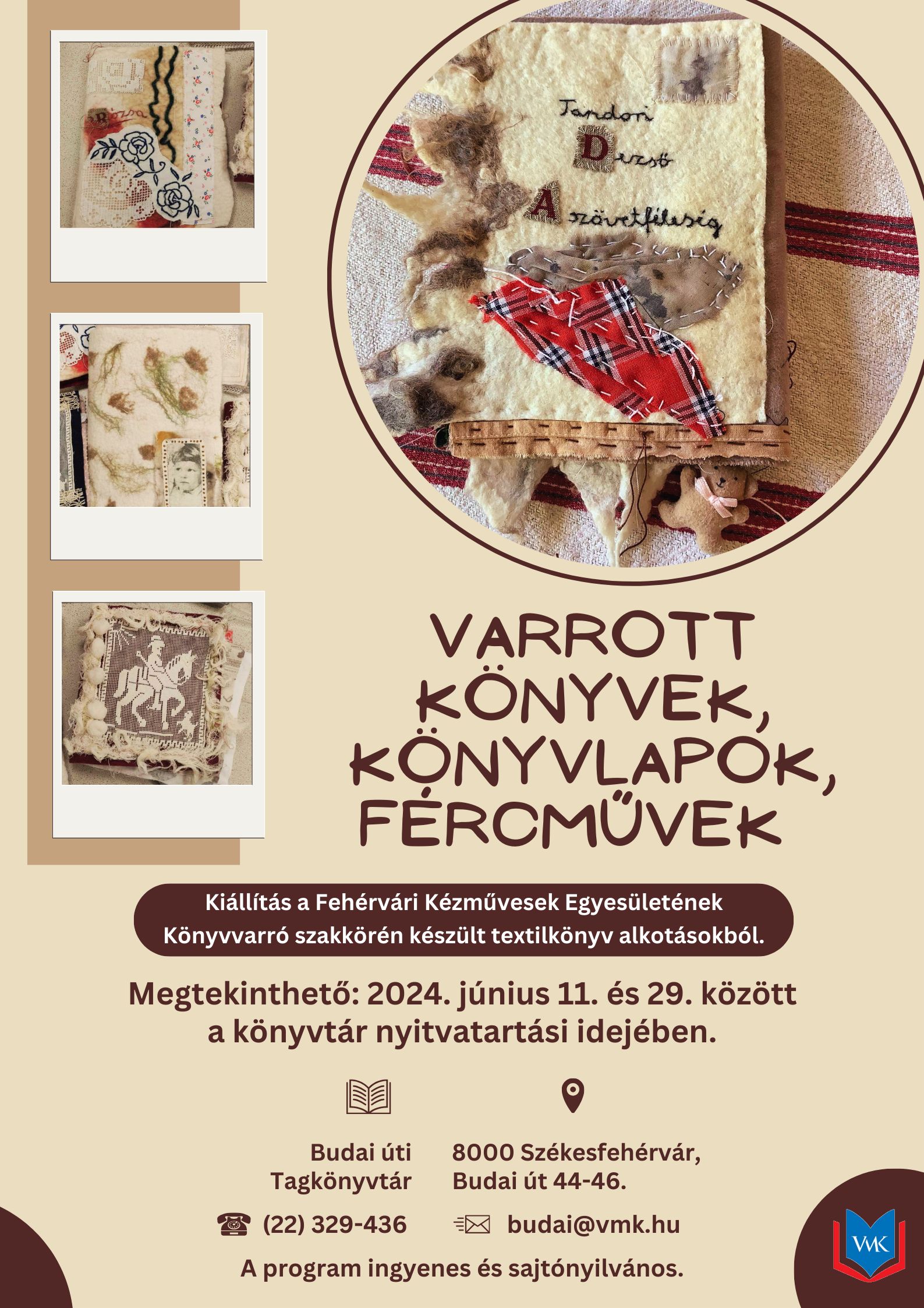Szintén szombatig, a Budai úti Tagkönyvtárban nézhetjük meg a Varrot könyvek, könyvlapok, fércművek című összeállítást, amely a Fehérvári Kézművesek Egyesülete textilkönyv-készítő műhelyében készült alkotásokból mutat be válogatást. A VMK Gyermekrészlegén az Igazgyöngy Alapítvány növendékeinek gyermekrajzaiból állítottak össze tárlatot, amely július 13-ig tart nyitva.