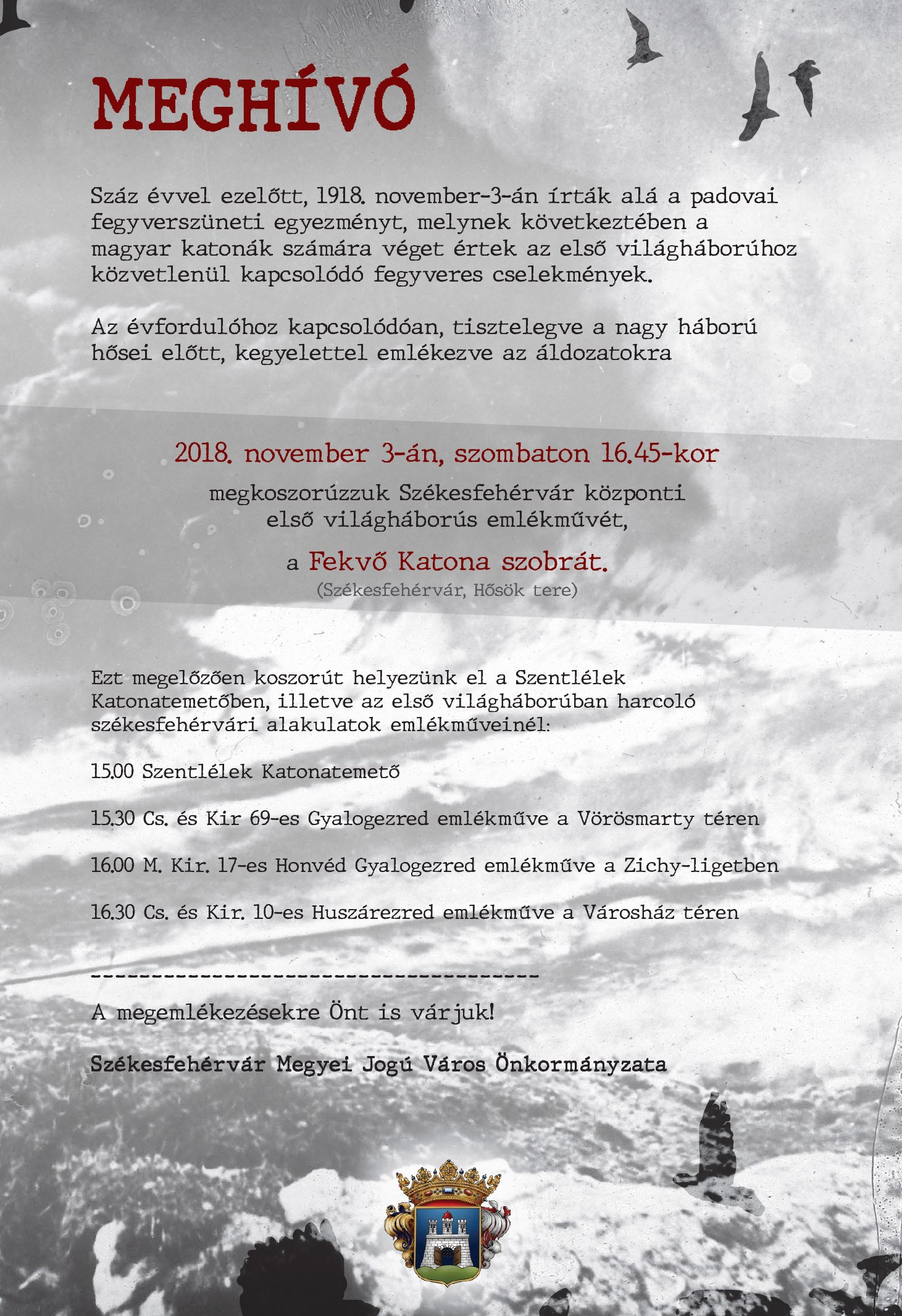 Az évfordulóhoz kapcsolódóan, tisztelegve a nagy háború hősei előtt, kegyelettel emlékezve az áldozatokra, Székesfehérvár önkormányzata csendes megemlékezést, gyertyagyújtást és koszorúzást szervez november 3-án, szombaton 16.45-kor a város központi első világháborús emlékművéhez, a Fekvő Katona szobrához. Minden emlékezőt várnak a szervezők!