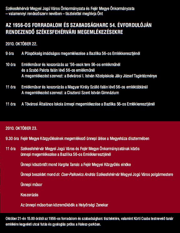 Székesfehérvár Megyei Jogú Város Önkormányzata és Fejér Megye Önkormányzata - valamennyi rendezőszerv nevében – tisztelettel meghívja Önt az 1956-os forradalom és szabadságharc 54. évfordulóján rendezendő székesfehérvári megemlékezésekre
