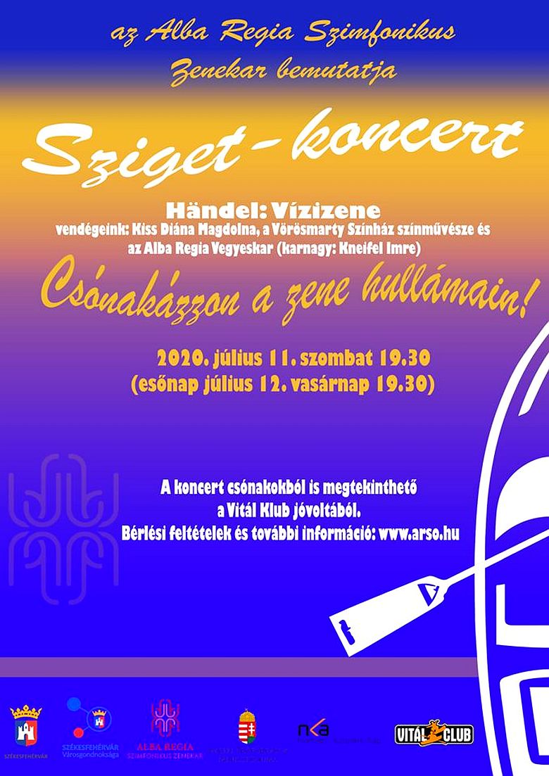 Július 12-én 19:30-ra halasztották az Alba Regia Szimfonikus Zenekar koncertjét az erős szél miatt. Vasárnap este a Csónakázó-tó szigetén csendül fel Händel három szvitből álló Vízizenéje Kiss Diána Magdolna színművész közreműködésével. A már előjegyzett csónakok bérlete természetesen automatikusan érvényes vasárnapra is!