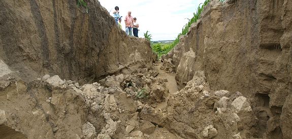 A kukorica egyelőre kicsi ezen a területen, úgyhogy jól láthatóak még a mélyedések. Nem árt az óvatosság, hiszen négy-öt métert is lehet zuhanni a széléről. A hasadékba belemászni életveszélyes, így attól mindenkit óvaintenek.