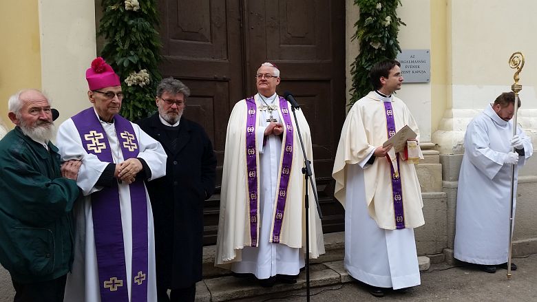"A szentév mindannyiunk és az egész emberiség számára megnyitja Isten irgalmának kapuját. A mai ünnepünk a világegyházzal közösségben ünnepélyesen nyitja meg a kaput a mi egyházmegyénk számára és ezzel kezdetét veszi számunkra a kegyelem mély átélésének tapasztalata. Örömmel hallgatjuk meg az irgalom evangéliumát, melyet urunk, Krisztus, az Isten báránya soha meg nem szűnik hirdetni az emberek között, ezzel hív bennünket, hogy örüljünk az ő szeretetének, amit fáradhatatlanul áraszt minden teremtményre." - mondta el az irgalmasság kapujánál Spányi Antal püspök. Beszédét követően az evangélium igéit olvasták fel.