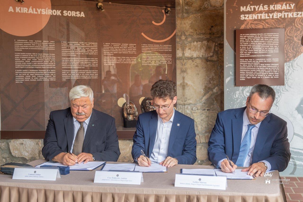 Az erről szóló együttműködési megállapodást Dr. Gellén Márton, a Magyar Polgári Együttműködés Egyesület főtitkár alelnöke (jobbra), Dr. Lomnici Zoltán, az Emberi Méltóság Tanácsának elnöke (balra) és Dr. Cser-Palkovics András, Székesfehérvár Megyei Jogú Város polgármestere írták alá szerdán délután a Nemzeti Emlékhelyen.