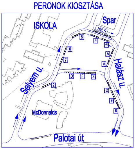 A Selyem utca egyirányú lesz a Palotai úttól a Spar áruházig, illetve a Halász utca egyirányú lesz a Spar áruháztól a Palotai útig. A Spar melletti összekötő út iránya megfordul. Az egyirányú útszakaszok három sávosak lesznek, a „murvás” parkoló felőli sávon autóbusz-megállóhelyek kerültek kialakításra. Az egyirányúsítás miatt a helyi járatok iránya is megfordul, ezért a megállóhelyek áthelyezésre kerülnek. Fentiek miatt a Tolnai utcából és Csapó utcából csak balra lehet kikanyarodni. 2006. július 1-jétől a helyközi és távolsági autóbusz-járatok már az ideiglenesen kijelölt helyeken állnak meg!