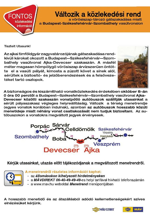 Mint ismeretes, Ajka és Devecser térségben a vonatközlekedés is megszűnt, hiszen az iszapáradat 1500 méteren sodorta el a vasúti síneket, biztosítóberendezéseket és felsővezeték tartóoszlopokat. A megrongálódott pálya helyreállításáig a MÁV Csoport az utasokat vonatpótló autóbuszokkal szállítja Ajka és Devecser között, azonban a megnövekedett közúti menetidő miatt módosítani kellett a térség vasúti menetrendjét is. A változásokat a vasúttársaság 2010.október 8. 0 óra 0 perctől vezette be.
