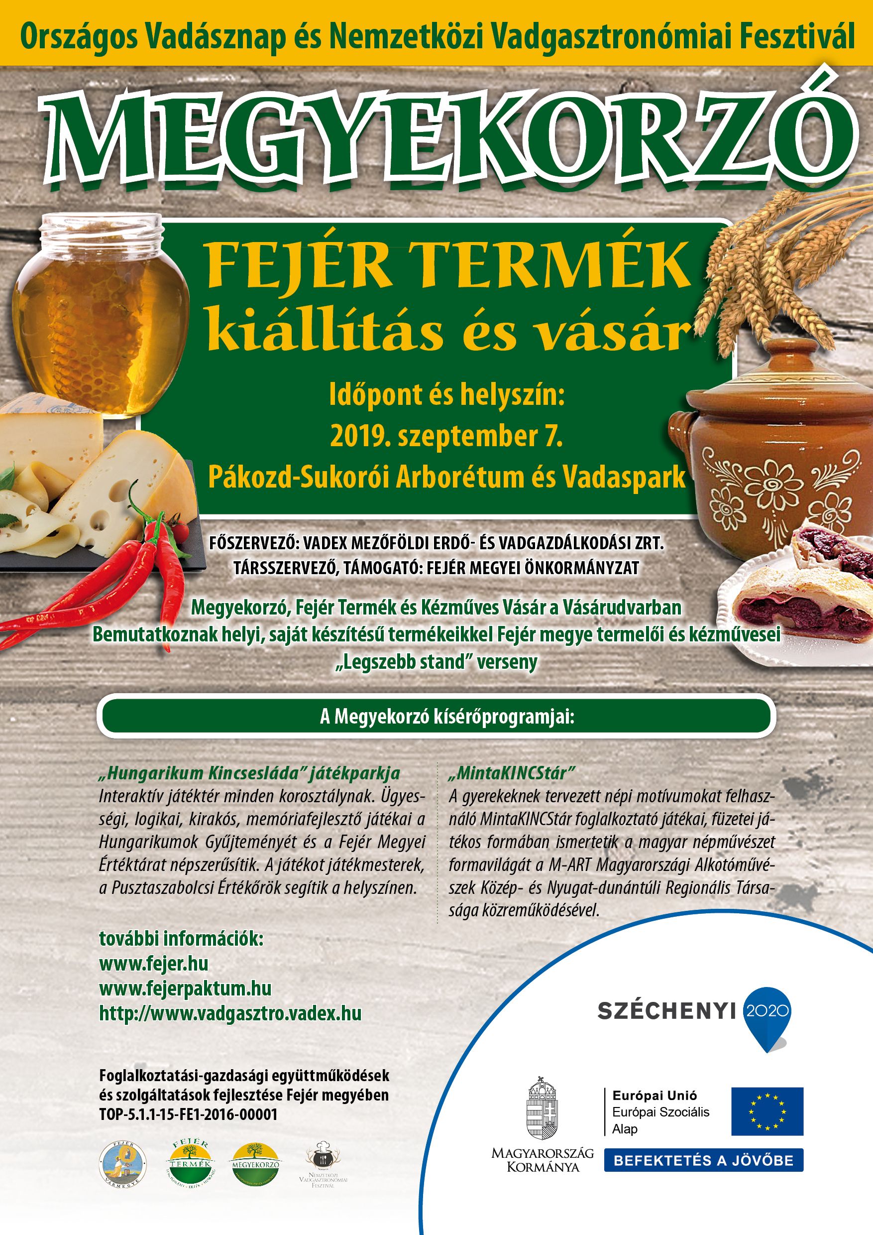 A 13. vadgasztronómiai fesztiválon Soponya után az idei évben új helyszínen, a megújult Pákozd-Sukorói Arborétum és Vadasparkban mutatkozik be második alkalommal a Fejér Megyei Önkormányzat társrendezőként a Megyekorzóval és Hungarikum játszóházzal. A „Megyekorzó résztvevői körében „Legszebb stand” versenyt is szervez a helyszínen. Az Önkormányzat célja, hogy a Megyekorzó és a Fejér Megyei Értéktár programjaival a megyében minél szélesebb körben megismertesse a helyi terméket és értékeket népszerűsítő tevékenységét.