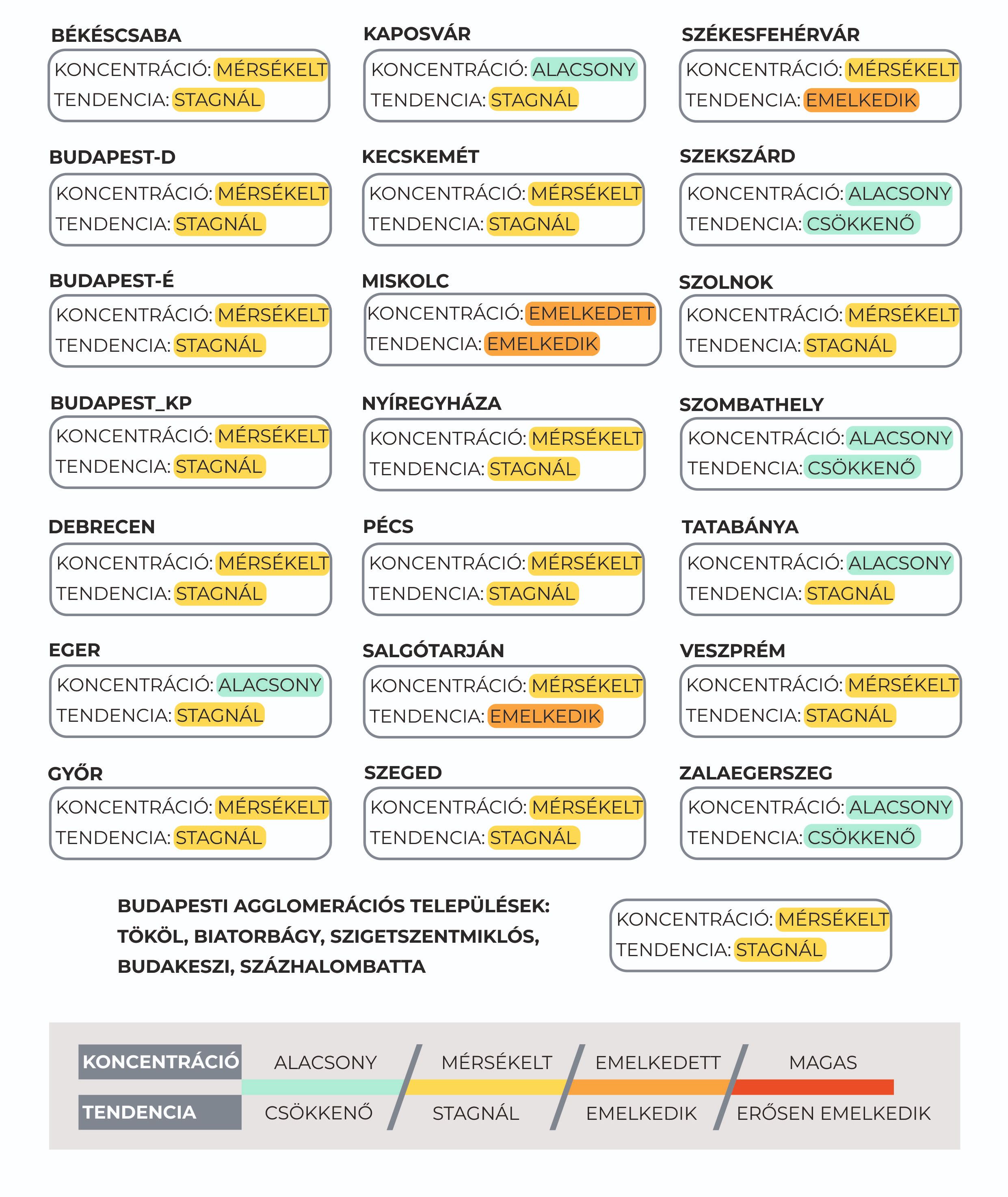 A szennyvíz SARS-CoV-2 koncentrációja továbbra is lassú ütemben, de folyamatosan emelkedik. A vizsgált városok közül emelkedő tendencia jellemző Miskolcon, Salgótarjánban és Székesfehérváron, míg csökkenő tendencia figyelhető meg Szekszárdon, Szombathelyen és Zalaegerszegen. A vizsgált többi városban a tendencia stagnáló.