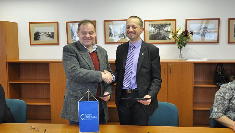 Szabó Péter rektor és Török Szabolcs a Klebelsberg Intézményfenntartó Központ Székesfehérvári Tankerületének, mint az Arany János Iskola fennntartójának kézfogása az együttműködési megállapodás aláírása után.