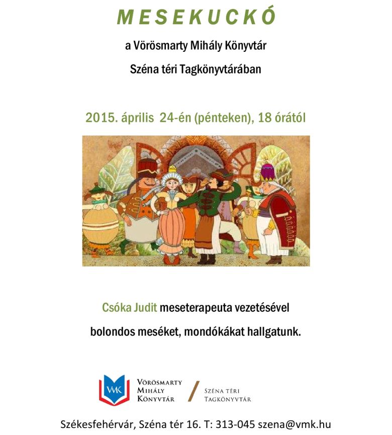 2015. április 24-én, pénteken este újabb kulturális programot szerveznek a Vörösmarty Mihály Könyvtár Széna téri Tagkönyvtárában (Széna tér 16.). A pénteken este 18 órakor kezdődő eseményen Csóka Judit meseterapeuta vezetésével, bolondos meséket és mondókákat hallgathatnak az eseményen résztvevők. A programra sok szeretettel várnak minden érdeklődőt a szervezők.