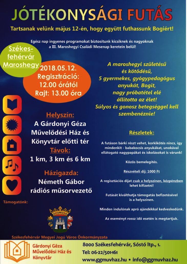 Május 12-én harmadik alkalommal szervezik meg a Maroshegyi Családi Mesenapot a Gárdonyi Géza Művelődési Ház és Könyvtárban, valamint a ház előtti téren. A Mesenapon jótékonysági futásra is sor kerül, amelynek teljes összegével egy Maroshegyen elő súlyos beteg, 5 gyermekes édesanyát támogatnak.