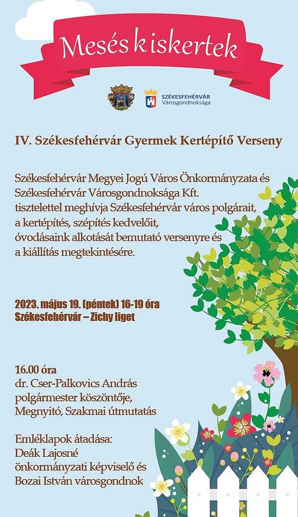 A székesfehérvári óvodások idén sem maradnak feladat nélkül: május 19-én, pénteken 16.00 órától Székesfehérvár Városgondnoksága és az Önkormányzat ismét megrendezi a népszerű, óvodák közti versenyt. A gyerekek ezúttal is jó hangulatban, egy 120x200 centiméteres területen rendezhetik be mesekertjeiket a Zichy ligetben a Zenepavilon körül. A IV. Mesés kiskertek részleteiről a verseny helyszínén tartott sajtótájékoztatót Deák Lajosné önkormányzati képviselő, a család- és nemzetpolitikai ügyek tanácsnoka, valamint Bozai István városgondnok, Homoki László, a Városgondnokság parkfenntartási vezetője és Hahn-Poszmik Réka parkfenntartási vezető-helyettes.