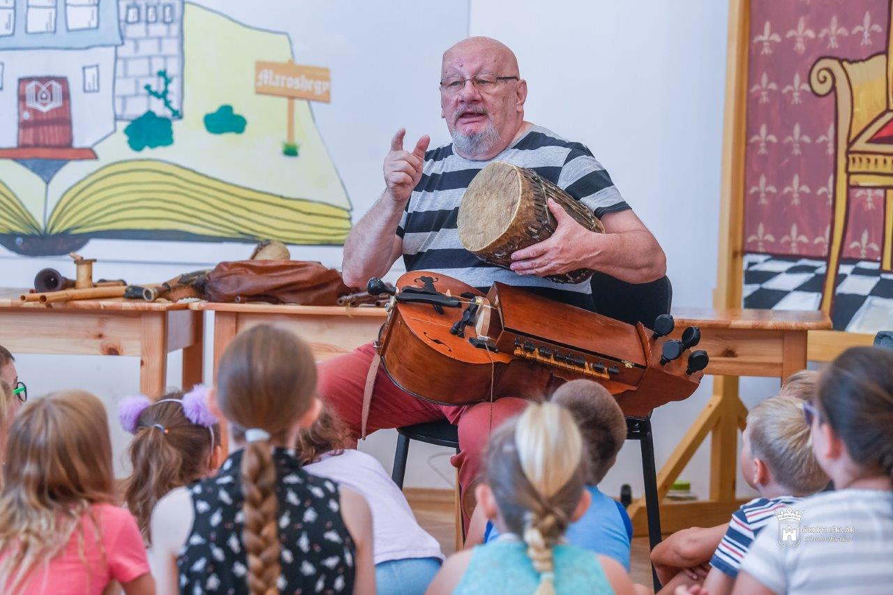 A Gárdonyi Géza Művelődési Ház és Könyvtár Mesetáborának résztvevői kedden délelőtt Bergerné Szőnyi Anna és Varró János zenepedagógusok vezetésével tettek egy nagy utazást a népi hangszerek világába. Énekeltek, táncoltak, meséltek a kisiskolásoknak.