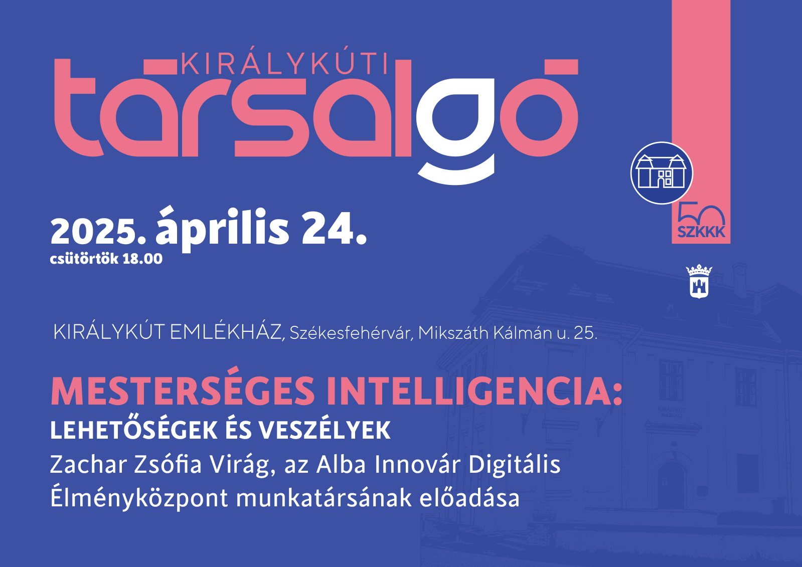 A Királykút Emlékházban (Székesfehérvár, Mikszáth Kálmán utca 25.) április 24-én, csütörtökön 18 órakor Zachar Zsófia Virág, az Alba Innovár Digitális Élményközpont munkatársának előadását hallgathatja meg a közönség Mesterséges intelligencia: lehetőségek és veszélyek címmel.