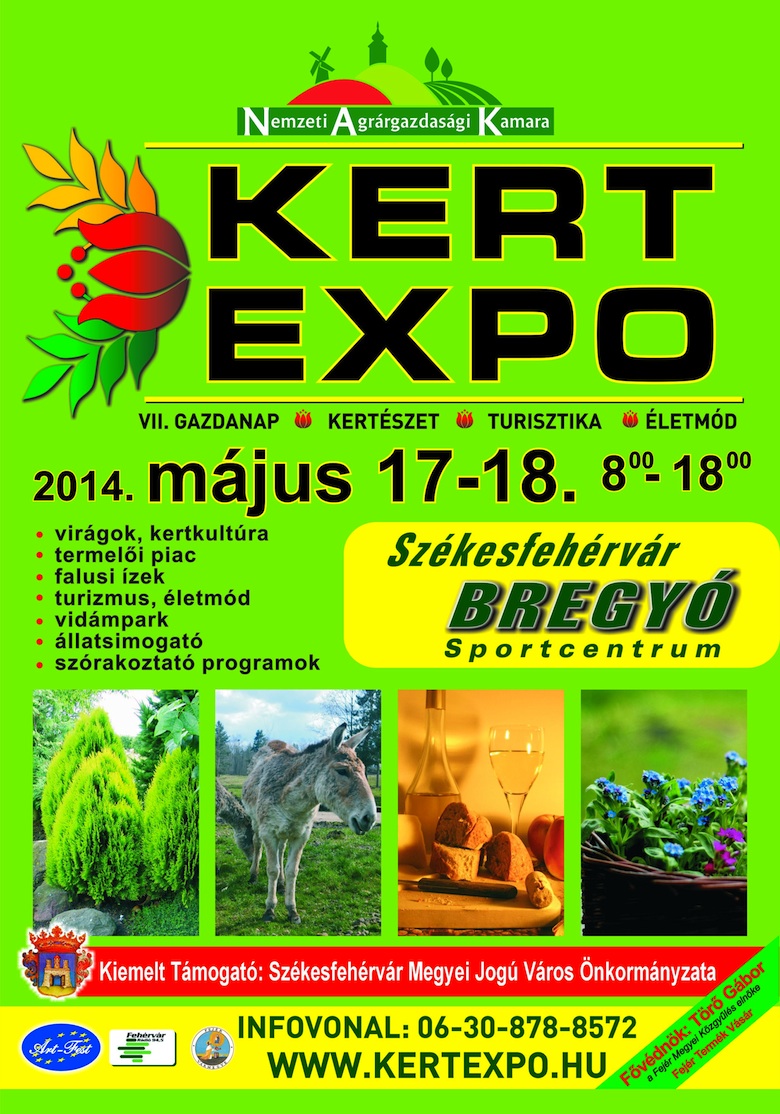Hetedik alkalommal rendezik meg a magyar agrárágazat egyik jelentős szakmai kiállítását és vásárát május 17-18-án a Nemzeti Agrárgazdasági Kamara közreműködésével a Bregyó Szabadidőközpont hangulatos füves területén. Az idei Kert-Expo kínálatában vásári hangulat közepette ismerkedhetnek meg az érdeklődők többek között a hazai termelők portékáival, egészséges termékek előállításával.