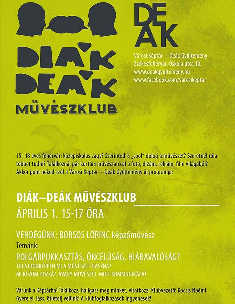 2015. április 1-jén, szerda délután 15 órától kezdődik a Városi Képtár – Deák Gyűjtemény új programjának, a „Diák-Deák Művészklub” ötödik előadása. A kulturális programon a 15-18 év közötti középiskolásoknak szóló esemény ötödik alkalmán Borsos Lőrinc képzőművész avatja be az érdeklődőket a művészet hasznába. Az ingyenesen látogatható klubfoglalkozás vezetője Kocsis Noémi lesz.