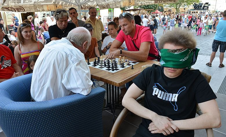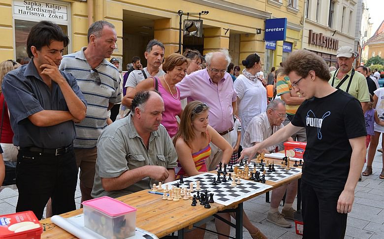 Csütörtökön valóban miénk volt a tér, és végre megtelt élettel a megújult Fő utca. A szervezők egész nap változatos programokat biztosítottak a Belvárosba látogatóknak, ezek között is üde színfolt volt Szabó Krisztián sakknagymester szimultán játszmája, ahol a jelentkezők negyven táblán mérhették össze tudásukat a kiváló sakkozóval. Krisztián megmérettetései viszont itt még nem értek véget, később bekötött szemmel mérkőzött meg a fehérvári kosárlabda legendás alakjával, Dávid Kornéllal.
