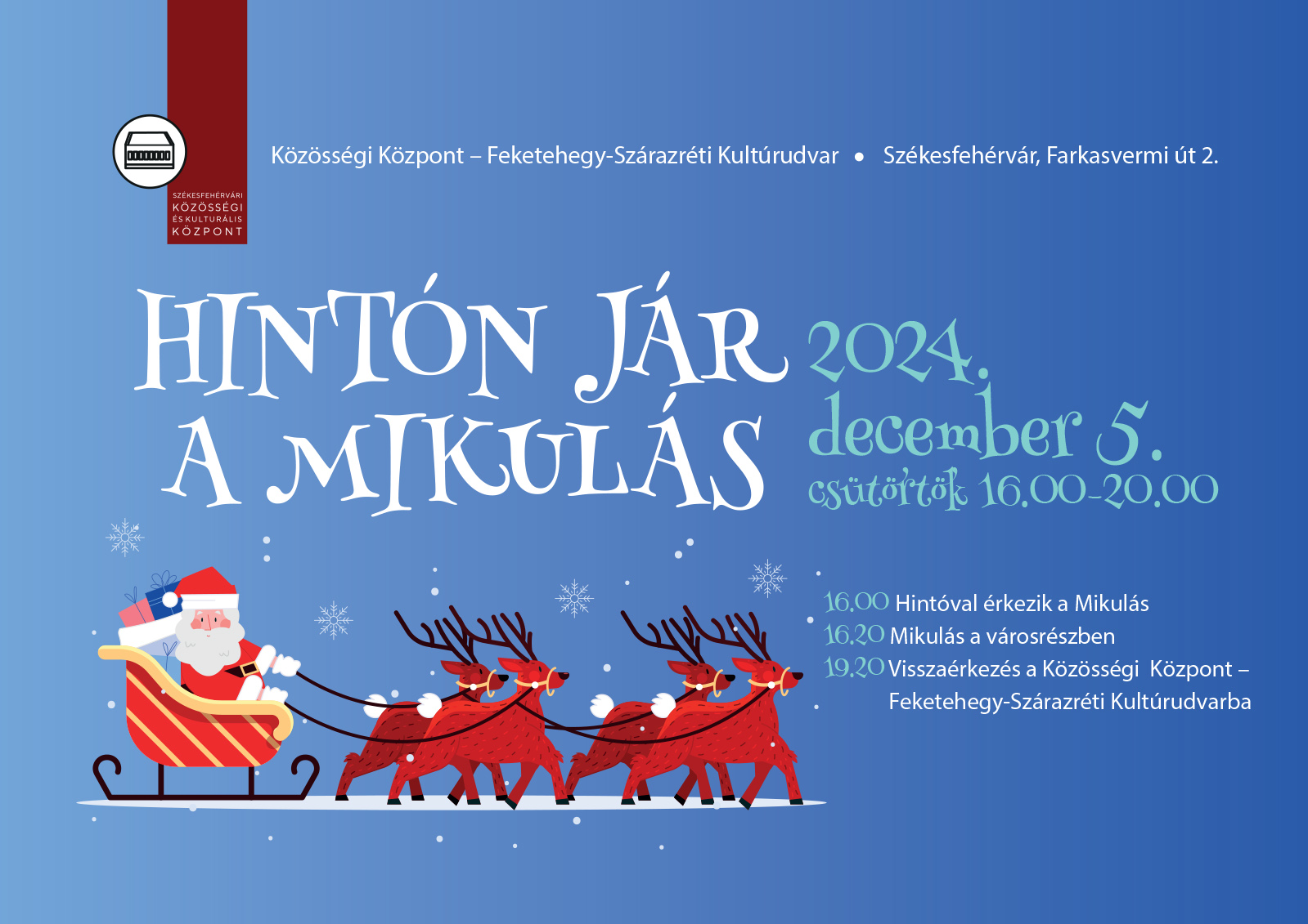 Hintón jár a Mikulás a Feketehegy-Szárazréti városrészben a Közösségi Központ –Feketehegy-Szárazréti Kultúrudvarból indulva december 5-én, csütörtökön. Délután négy órakor a közösségi házhoz érkezve lehetőség lesz közös énekléssel köszönteni a jóságos télapót. Valamivel negyed öt után a rénszarvasok helyetteseiként helytálló lovak által húzott hintóra felszáll a Mikulás és elindul a városrészben, hogy minél több gyerekkel találkozhasson, és meghallgassa a kívánságokat.