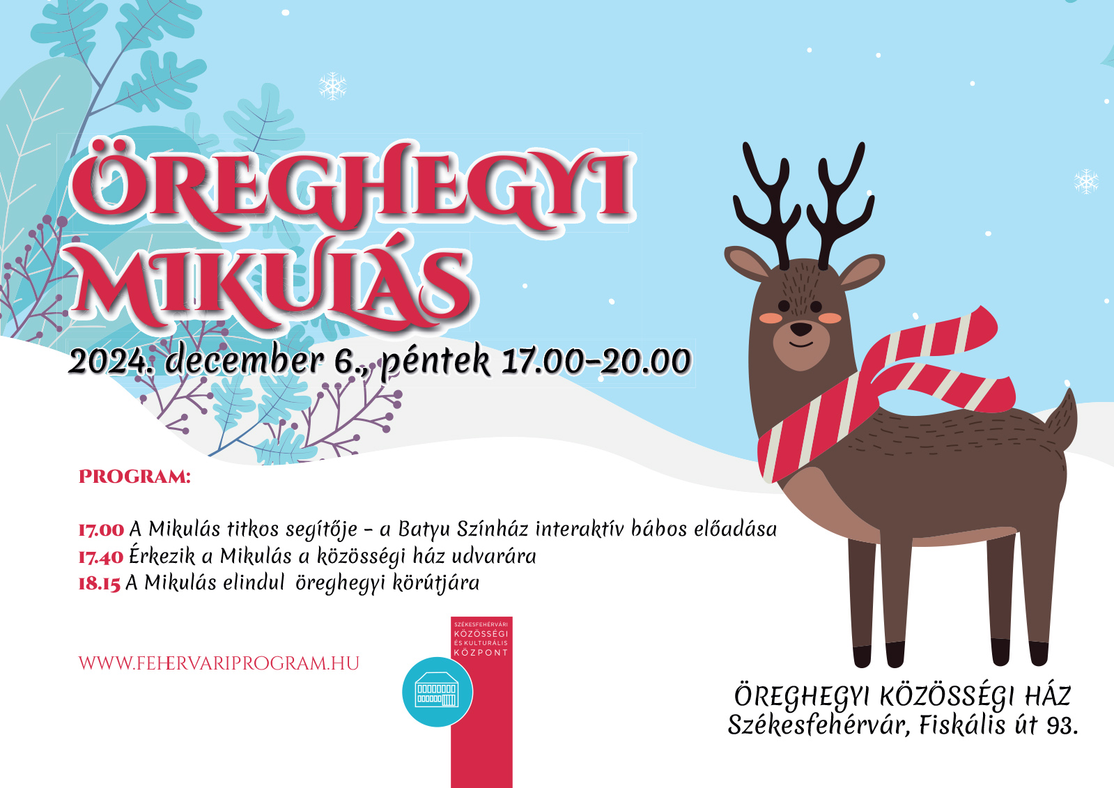 Öreghegyre szintén pénteken látogat a Mikulás. Az Öreghegyi Közösségi Házban december 6-án, pénteken délután öt órakor a Batyu Színház A Mikulás titkos segítője című bábszínházi előadása szórakoztatja a kicsiket és nagyokat, míg megérkezik a várva várt Télapó. Beteg lett a Mikulás, de akkor hogyan készülnek el az ajándékok? Lehet, hogy a gyerekek ajándék nélkül maradnak? Egyáltalán ki tudja meggyógyítani a Mikulást? Nagy feladat mindez, de a Mikulás titkos segítője és kis társai mindent megpróbálnak Öreghegyen, hogy a gyerekek ne maradjanak ajándék nélkül és a Mikulás is meggyógyuljon. És ehhez az öreghegyi gyerekekre is szükség lesz, a szereplők ugyanis a közönség soraiból is bevonnak néhány segítő kezet. Háromnegyed hat körül megérkezik a Mikulás a közösségi ház udvarára hintójával, amit ezúttal a rénszarvasok helyettesei, a lovak húznak majd. Itt lehetőség lesz fényképezkedésre, egy-egy jó szóra, éneklésre, kívánságra, aztán negyed hétkor a Mikulás felül lovaskocsijára és elindul öreghegyi körútjára.
