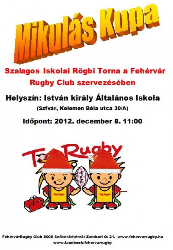 Nyílt teremrögbi kupát rendez december 8-án 11 órai kezdettel a Fehérvár Rugby Club az István Király Általános Iskola tornatermében. A játékosok a teremben is játszható, kontaktmentes (szalagletépős) TAG-rögbiben mérkőznek. Ebben az évben két kategóriában, kezdő (akinek nincs jártassága) és haladó (akik már játszották ezt a játékot) csapatok mérik össze erejüket. Három korcsoportban 12 csapat mérkőzik egymással.
