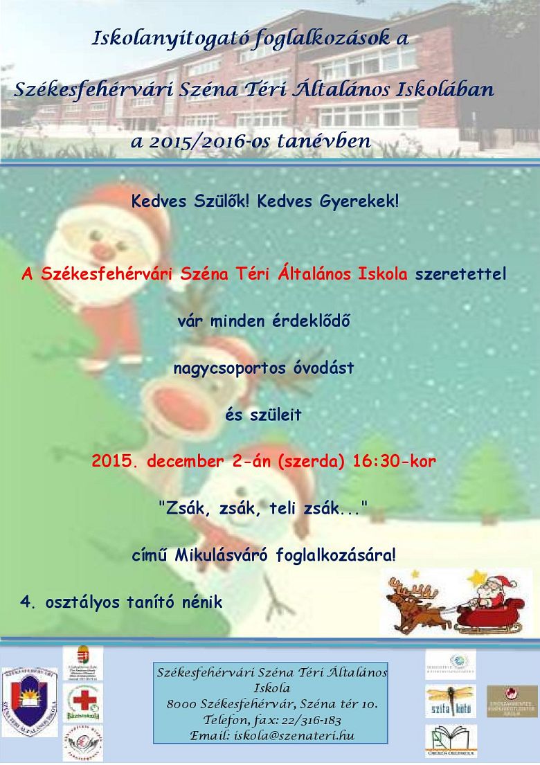 A Széna Téri Általános Iskolában december 2-án, szerdán 16.30-tól Mikulásváró foglalkozásra várják a nagycsoportos, leendő első osztályos gyermekeket és szüleiket. A játékos programokat Zsák, zsák telizsák címmel rendezik meg az intézményben.