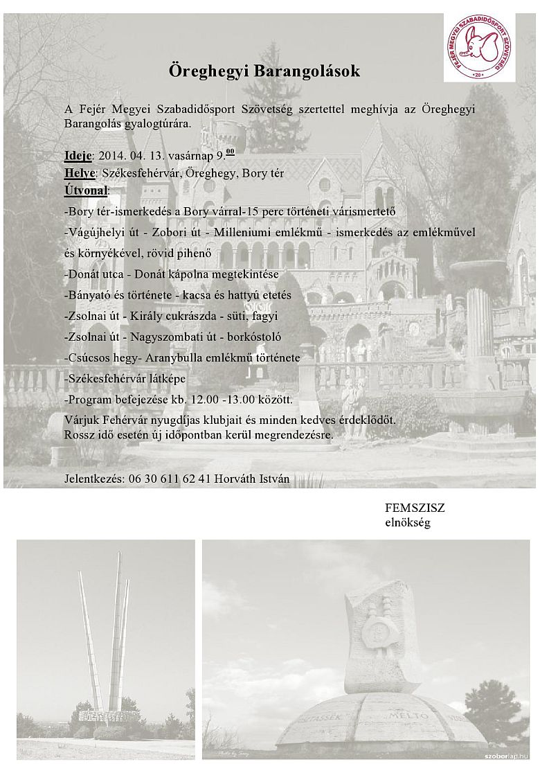 Április 13-án, vasárnap a Fejér Megyei Szabadidősport Szövetség „Öreghegyi Barangolások” néven gyalogtúrát szervez. A kiránduláson résztvevők többek között a Bory várat, a Donát kápolnát is megtekinthetik, valamint az Aranybulla történetével is megismerkedhetnek. A találkozó vasárnap reggel 9 órakor lesz Öreghegyen, a Bory téren. Rossz idő esetén másik időpontban rendezik meg az „Öreghegyi Barangolásokat”.