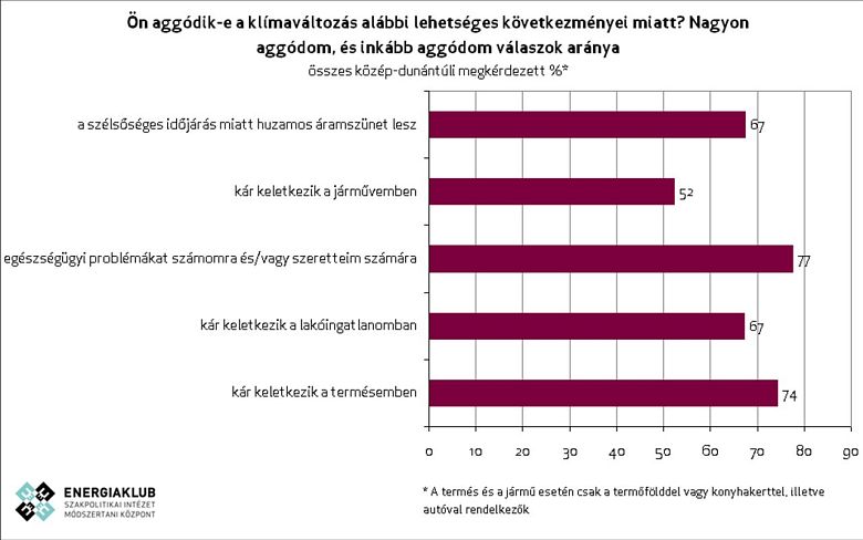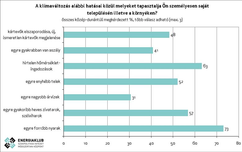 Az Energiaklub kutatásából kiderül, hogy a közép-dunántúli régióban tízből heten a saját környezetükben is egyre forróbb nyarakat tapasztalnak. Tízből hatan hirtelen hőmérséklet-ingadozásokat és egyre gyakoribb heves zivatarokat, szélviharokat észlelnek lakóhelyükön. A közép-dunántúli lakosok leginkább attól tartanak, hogy a klímaváltozás egészségügyi problémákat okoz számukra vagy szeretteik számára. Sokan aggódnak amiatt, hogy kár keletkezik termésükben illetve lakóingatlanukban, valamint hogy a szélsőséges időjárás miatt huzamos ideig tartó áramszünetek alakulhatnak ki.