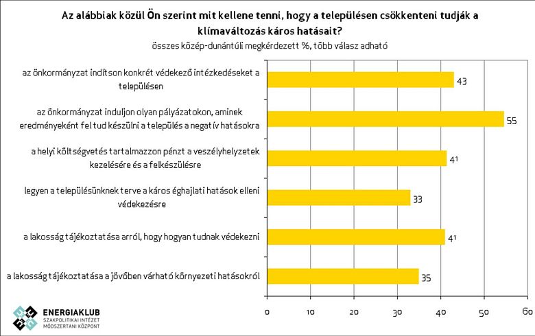 A közép-dunántúliak háromnegyede védtelennek érzi magát a klímaváltozás hatásaival szemben.Nagyjából ugyanennyien érzik úgy, hogy nem kapnak elég segítséget ahhoz, hogy védekezni tudjanak a káros következmények ellen. A válaszadók több mint fele gondolja úgy, hogy önkormányzatának olyan pályázatokon kellene indulnia, amelyek segítségével a település fel tud készülni a negatív hatások kezelésére.