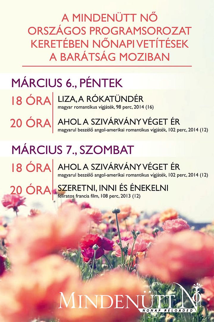 A Barátság mozi idén is csatlakozott a Mindenütt Nő országos program- sorozathoz, amelynek keretében három olyan filmet vetítenek, amelyek középpontjában a női sorsok állnak: két romantikus vígjátékkal és egy filmdrámával várják a nem csak női nézőket március 6-án és 7-én.