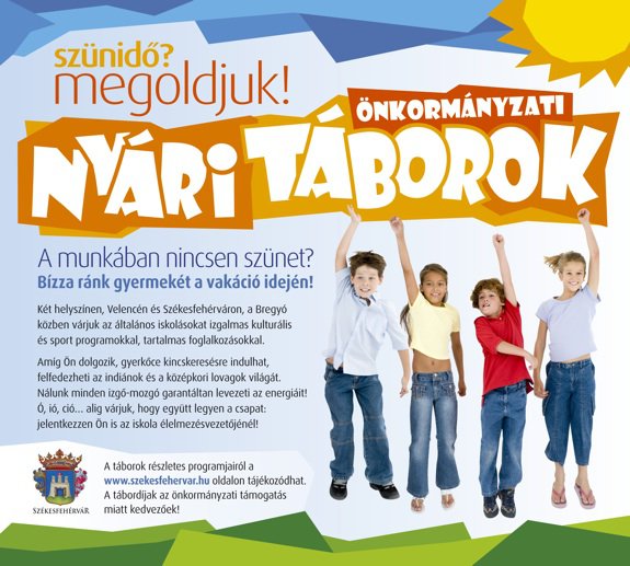 Székesfehérvár önkormányzata idén is két helyszínen rendez tábort az általános iskolások számára. A Bregyó-közben az eddigiekhez képest bővebb programkínálattal, sokrétű kulturális tevékenységgel, a Velencén megvalósuló Székesfehérvári Gyermek- és Ifjúsági Táborban pedig kalandokat ígérő tematikus összeállítással várják a gyerekeket.