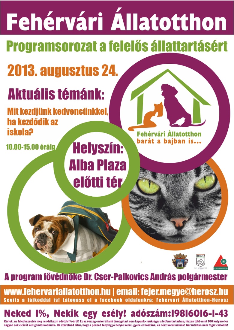 A „Fehérvári Állatotthon – Közelebb a polgárokhoz” című hatrészes sorozat szeptember 28-án, szombaton folytatódik. A programok fővédnöke dr. Cser-Palkovics András polgármester.