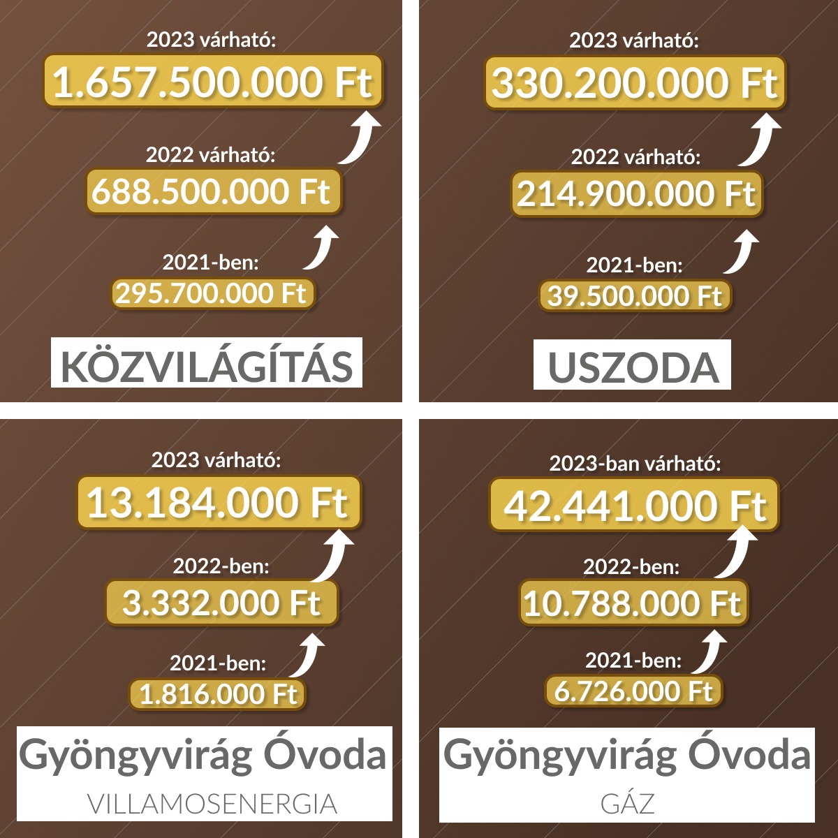 4. Gyöngyvirág Óvoda villamosenergia: 2021: 1.816 eFt, 2022-ben várható: 3.332 eFt, 2023-ban várható: 13.184 eFt. Ez a jelentős emelkedés természetesen óvodánként megjelenik.
